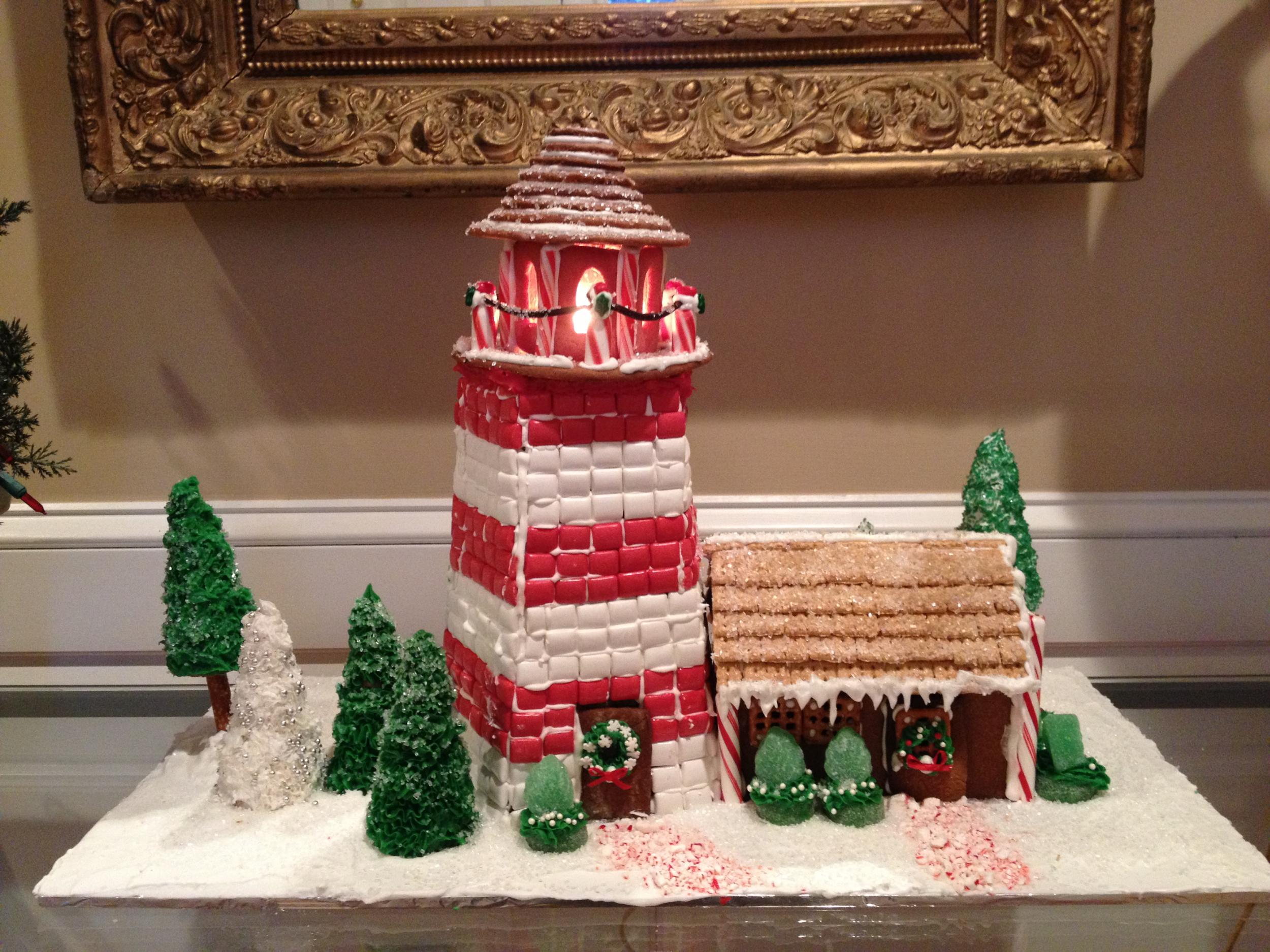 | Description: This gingerbread lighthouse and keeper's cottage is surrounded by ice cream cone and pretzel trees and a snow-drifted landscape. The lighthouse is constructed of gingerbread, lots of cinnamon and mint gum, candy cane poles, licorice handrails, gelatin windows, and a beacon of light perched inside the beacon. The keeper's cottage is constructed of gingerbread with a thatched roof using mini graham crackers. Landscaped plantings are gumdrop circles with fragrant gumdrop leaves atop them. Dragees and sprinkles twinkle on trees and wreaths and give the illusion of real light. All of it is held together with plain white royal icing. The lighthouse was lots of fun to make and is a whimsical twist on my more traditional annual creations. I can only imagine the happy traveler who is welcomed home by the glow of the keeper's light.
