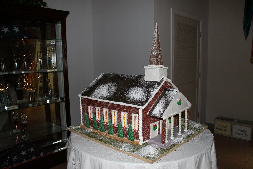 | Description: Inspiration was my home church.. Gingerbread and fondant were predominately used.. Melted frozen chilled gummy bears were used for The stained glass windows. And Royal Icing to decorate and put together. Trees made from Chocolate and parsley grass with shredded brown coconut for flower beds.