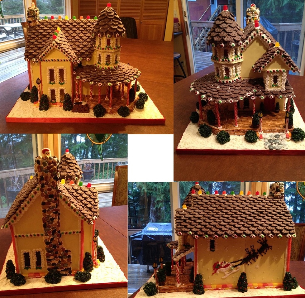 | Description: 2012 Ultimate Gingerbread Holiday Gingerbread Contest - Best Entry using an Ultimate Gingerbread pattern. The walls are poured royal icing for 'paint', front porch is topped with gum paste that I've pressed a wood grain into. I've gone over it by hand to make the detail sharper, and it was painted with food coloring. The chimney is made with chocolate rocks, as well as the walkway. The shrubs are cereal marshmallow treats that were dyed with food color then painted to touch up. There is a Santa in the front window as well as a candy tree in the turret that is hard to see from the picture. Santa and his reindeer are piped on the right side in royal icing and the foundation is made from starburst candy. The roof is made from Oreo Thin Crisps because of their 100th anniversary this year. Everything, including supports is edible except the board. Stats: Views: 444 Total Favorities: 0 View Who Favorited Posted by: GingerbreadExchange September 22, 2014, 11:01:36 amTotal Likes: 0