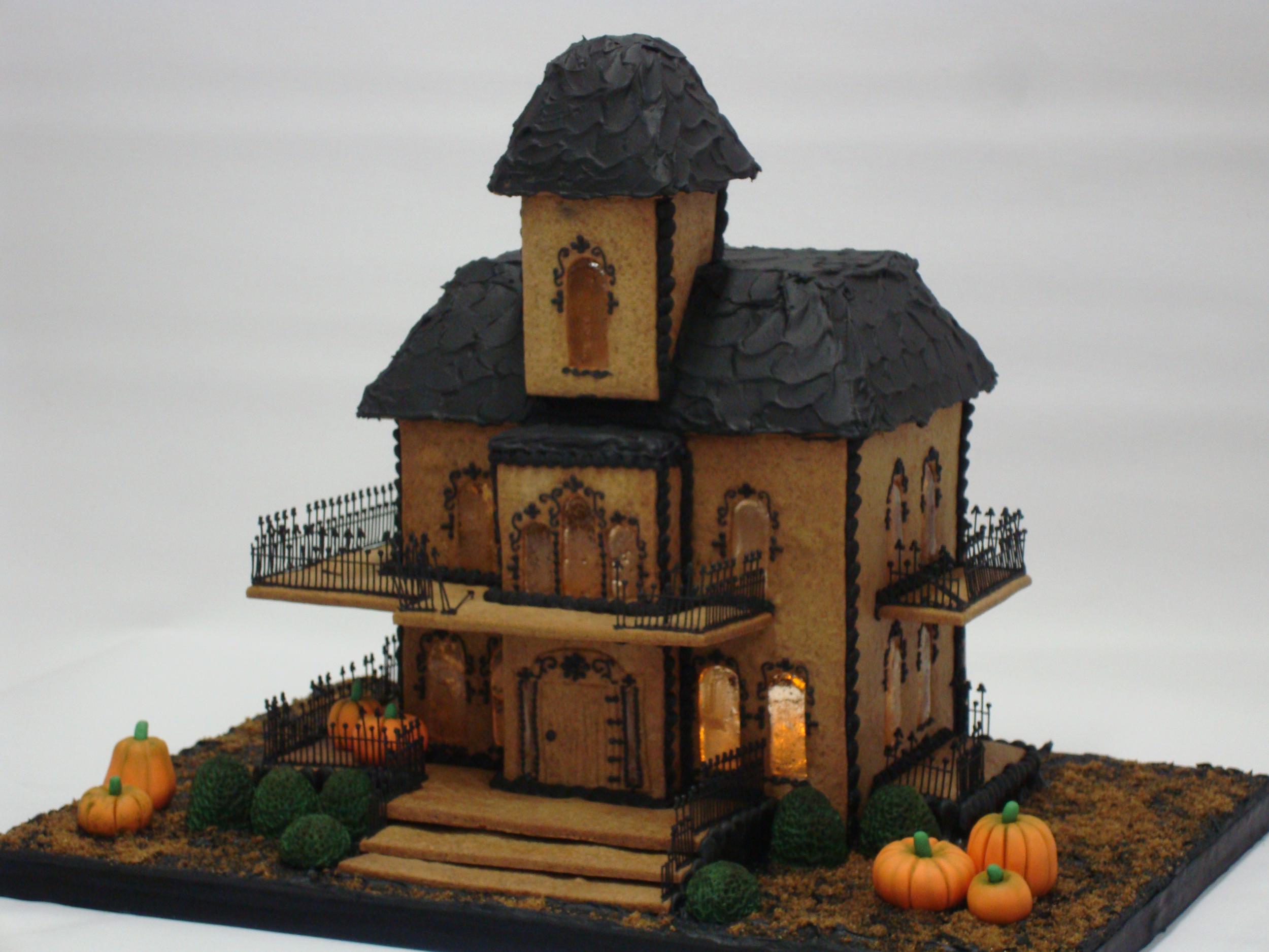 | Description: Everything edible. I used candy for the windows, pumpkins and topiary are sugar paste. Decorative piping and fence are Royal Icing.