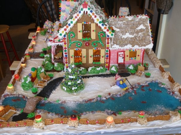 | Description: What a fabulous Gingerbread display by Christi Hall! This lucky gingerbread-home owner has a stream running thru their property, a tree fort with a tire swing, a cute snowman family, children playing, a wishing well, a loving dedication, and lots and lots of candy! There is so much to look at!