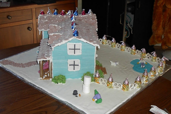 | Description: Blue Farmhouse Gingerbread House by Reah Lamfers