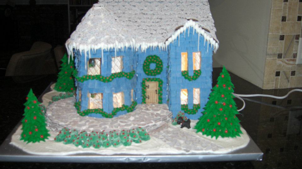 Description: I skipped the porch roof so that the "slate" would be more visible (Cracked chocolate Necco wafers). Nonpareils for the roof. Home made gumpaste shingles (It takes a LOT of shingles to cover a house!). Bonus - Found licorice Scotty dogs at the grocery store.