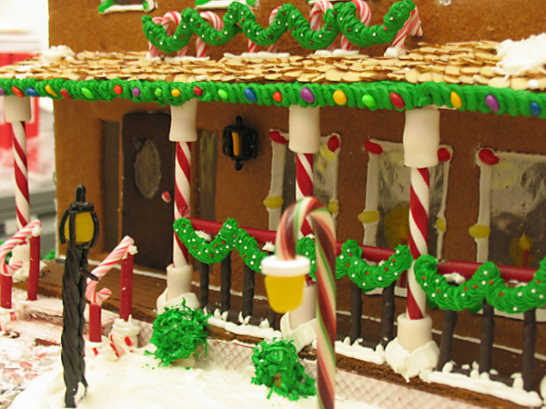 | Description: Beautifully created Gingerbread House by Debbie & Ed Stevens. Love the grand rock fireplace/chimney, candy cane porch details, fun colorful jelly-been roof, and Christmas tree under the gazebo.