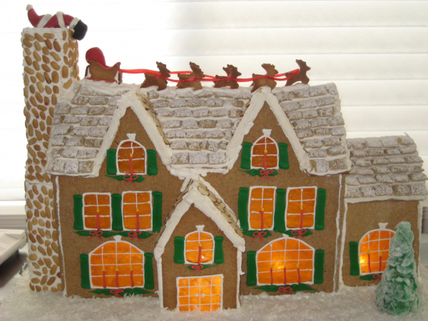 | Description: What a sweet classic gingerbread house created by Laura Evans. If you look close, you can see Santa peeking down the chimney while his reindeer and sleigh wait on the roof line. I love all the windows allowing for the light to shine through.