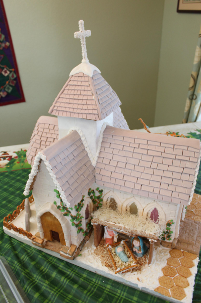 | Description: Took me two Christmas seasons to make. My daughter designed the church and I built and got hte pastillage roof on year one --then ran out of steam. Finished the rest last year. . .Unfortunately my homemade hard candy windows 'melted' in during the Texas summer so replaced with some neat candy paper I found during a trip to the Netherlands. Around back is a graveyard with headstones . . . Finished product was approximately 3 ft by 2 ft by 2 ft tall . . .