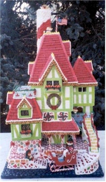 Description: My entry in 2001 Belleville Gingerbread walk. Received Best of Show. Hated the color, but I was using bubble gum tape, so the only color choices were green or pink!