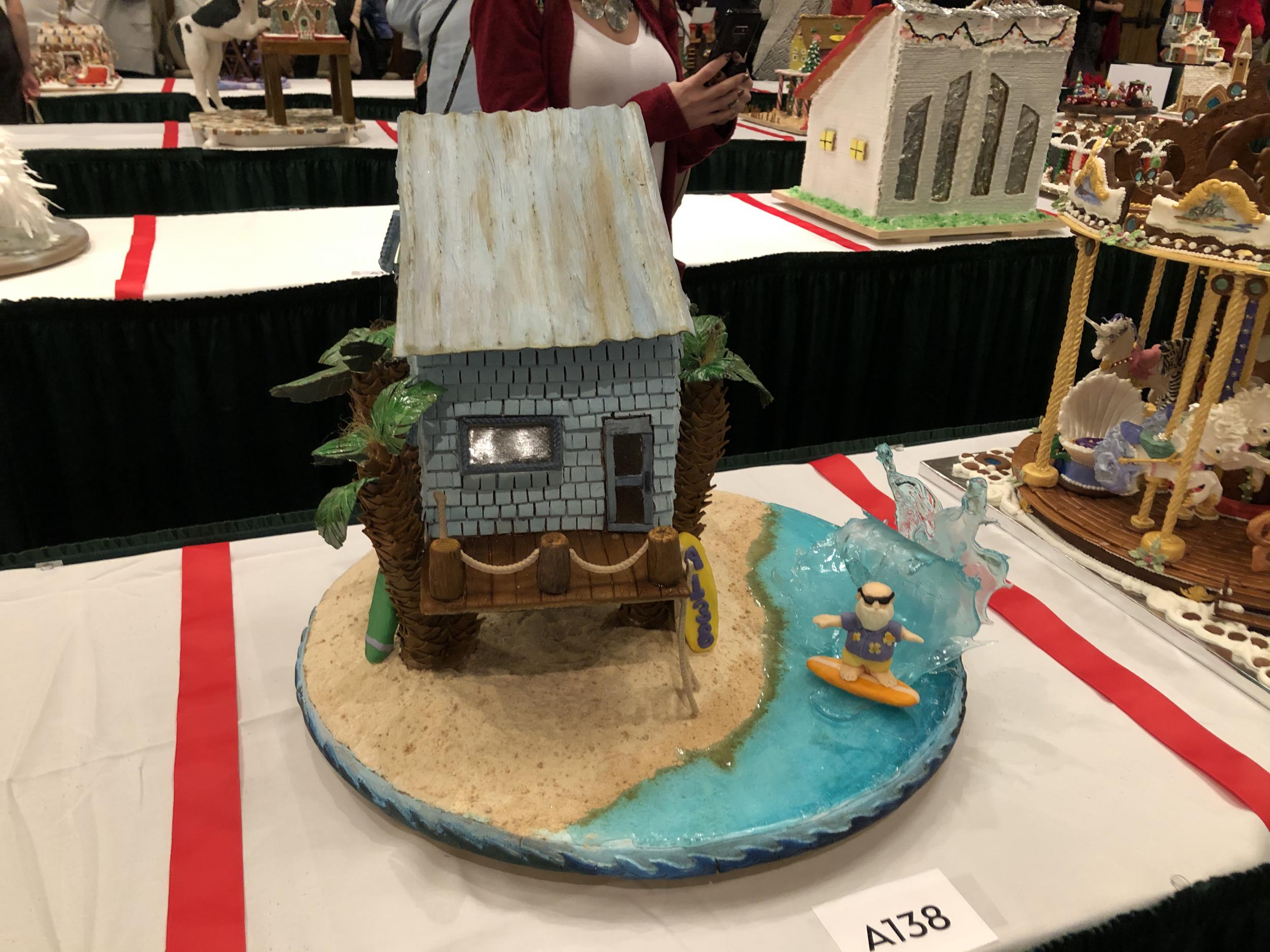 | Description: Esther Morris - Yule Tide; Santa is a relaxing on his own private island the day after Christmas! Here Santa catches a sweet wave made of poured isomalt. Except for the isomalt sugar and chocolate figure elements, it is constructed entirely of gingerbread with no internal supports. The house is traditional gingerbread construction put together with royal icing. Later Santa will relax in his “tin-roofed” beach house, which is supported only by 4 gingerbread palm trees. The roof, palm leaves and rope railing are made of edible ginger clay (made with ground ginger snaps), and everything is painted or colored with food coloring. Santa is modeling chocolate over spaghetti, and the surfboards are packed gingerbread covered with modeling chocolate. Happy Yule Tide!