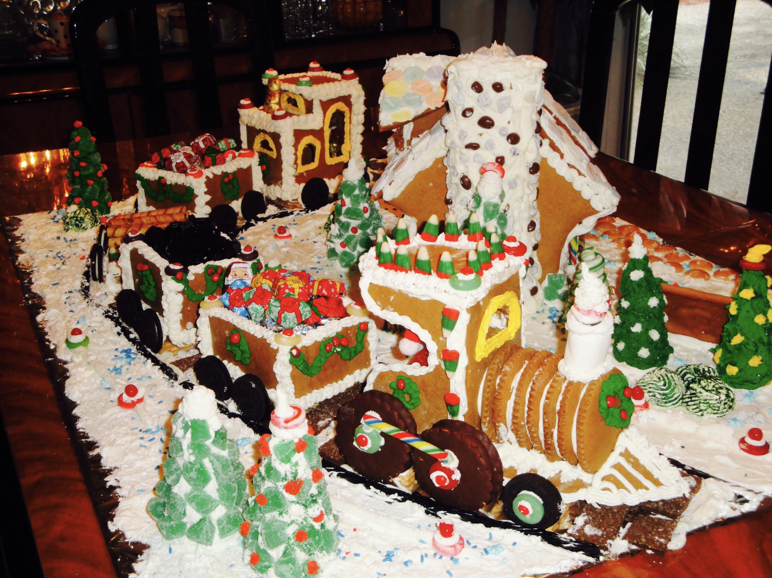 | Description: Frances Evans wins the Best Holiday Spirit Award with her Merry Choo-choo-mas gingerbread display. Frances uses homemade gingerbread dough, royal frosting, Oreo cookies for wheels, black licorice rails, and assorted candies in box cars. The lanscape is filled with waffle ice cream cones decorated with royal frosting for trees. This train is from the Santa-Express Train template available at www.gingerbreadexchange.com .