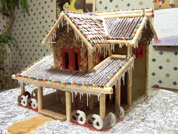 | Description: Mike Thorlakson does a great job building and decorating the Ultimate Gingerbread (Heceta) Beach House. The use of sliced almonds for siding and roofing, and Pirouette's for posts - what a fantastic idea!