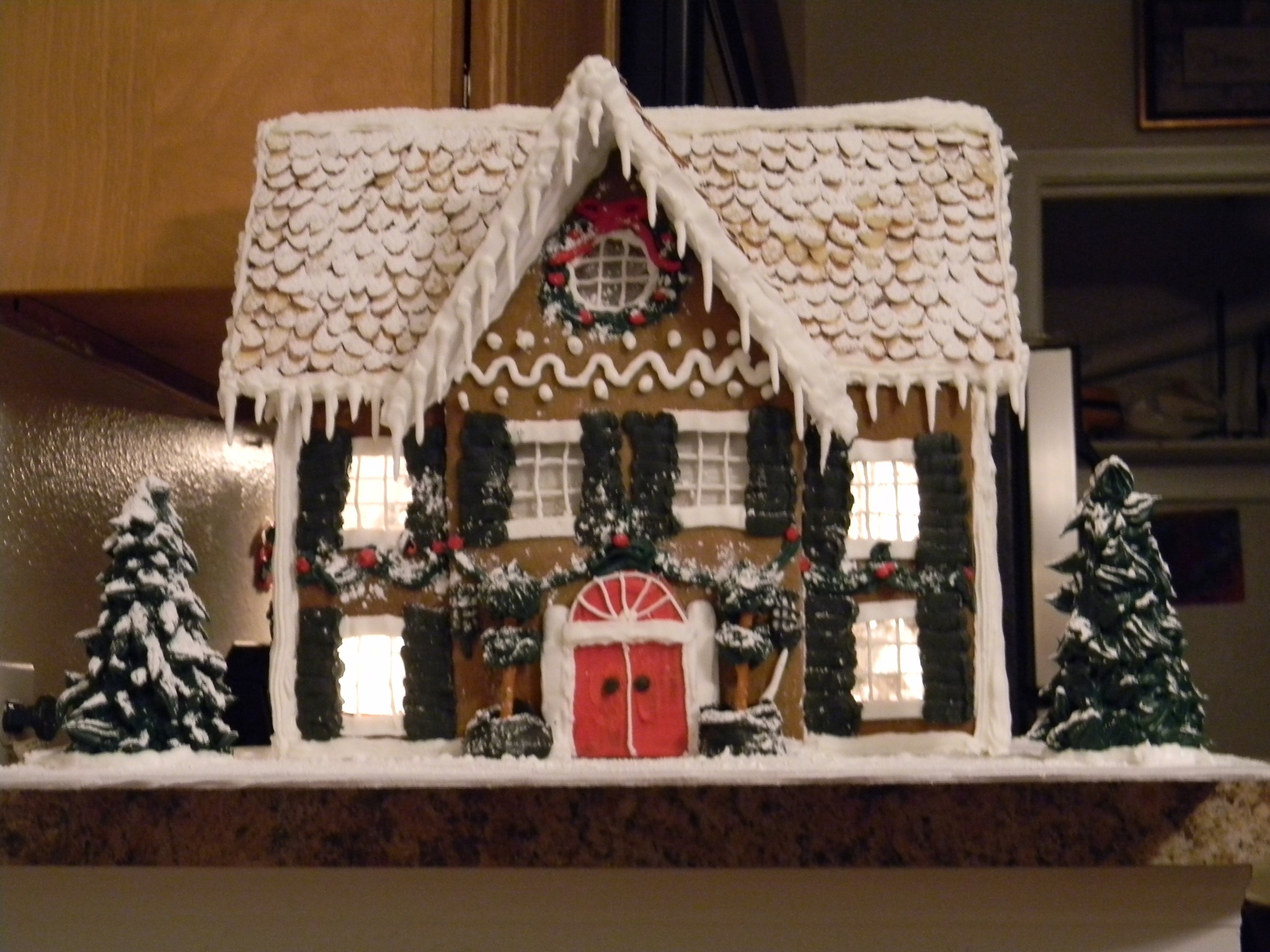 | Description: Used almond slivers for the roof, corn syrup and secret ingredient for windows, also gingerbread and my famous concrete mixture for icing that sticks like no bodies business.