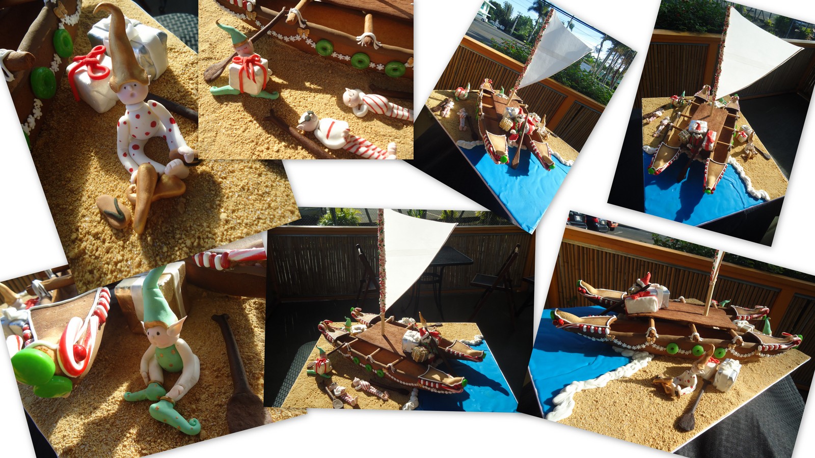 | Description: A double hull gingerbread canoe with a wafer paper sale and sugar paste elves and Santa. All items except for the mast are edible!